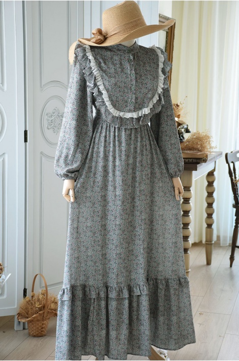 Çiçeki Bahar Elbise Su Yeşili Rengi