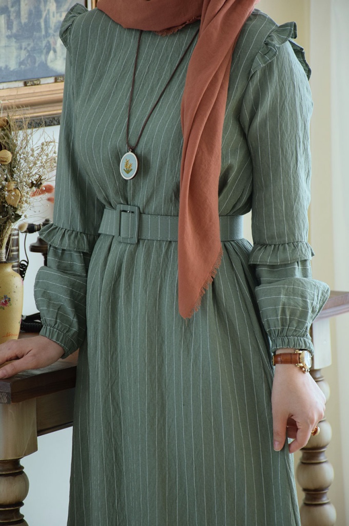 Çizgili Çağla Yeşili Renk Elbise