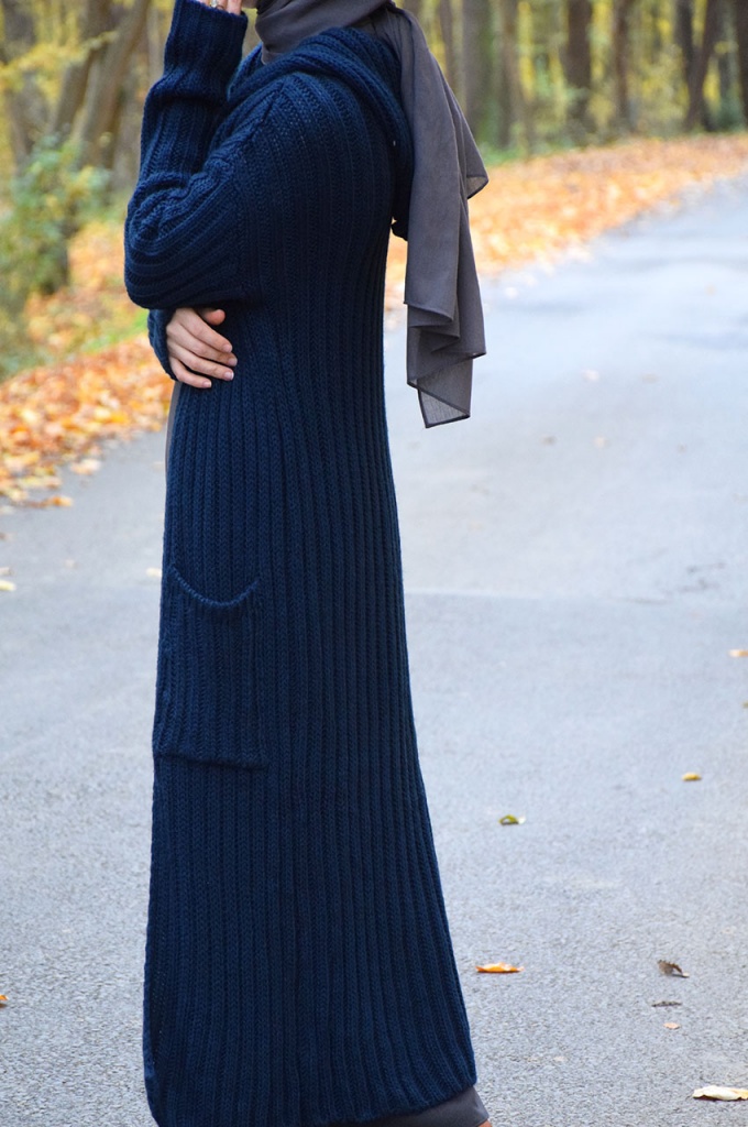 Lacivert Renk Kapüşonlu Örme Uzun Hırka