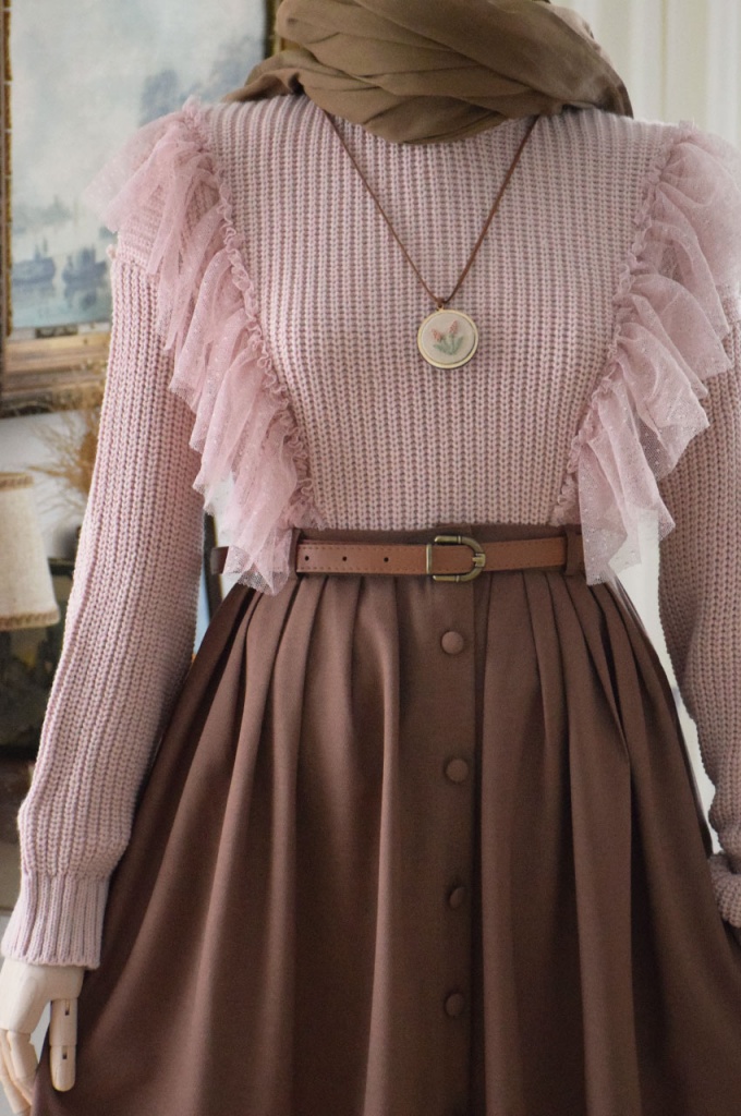 Su Dalgası Desenli Triko Bady Pembe Renk